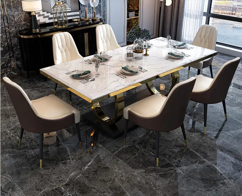 Luchshaya tsena - Мраморный обеденный стол и стул сочетание прямоугольный маленький бытовой обеденный стол из нержавеющей стали Spetsial'naya tsena